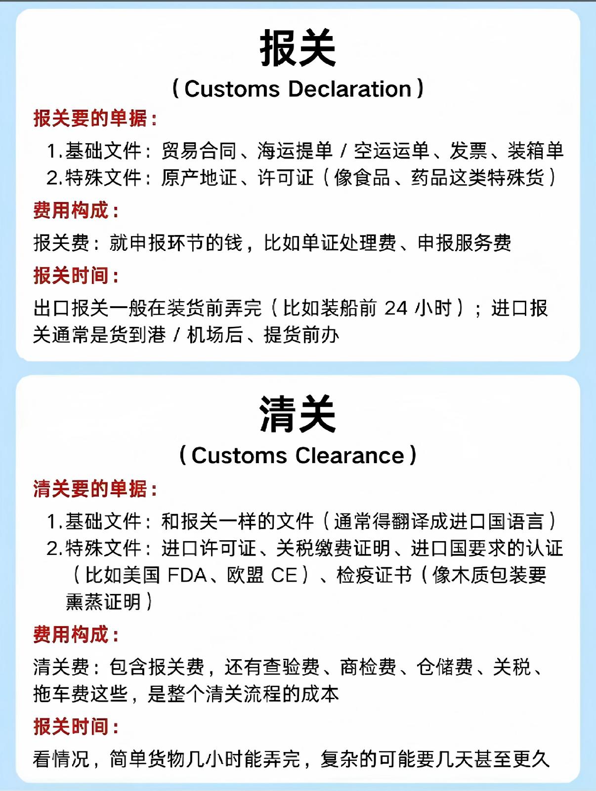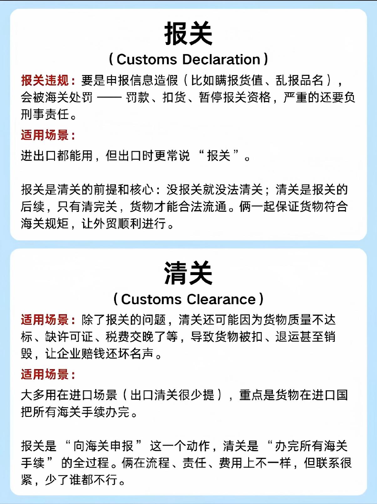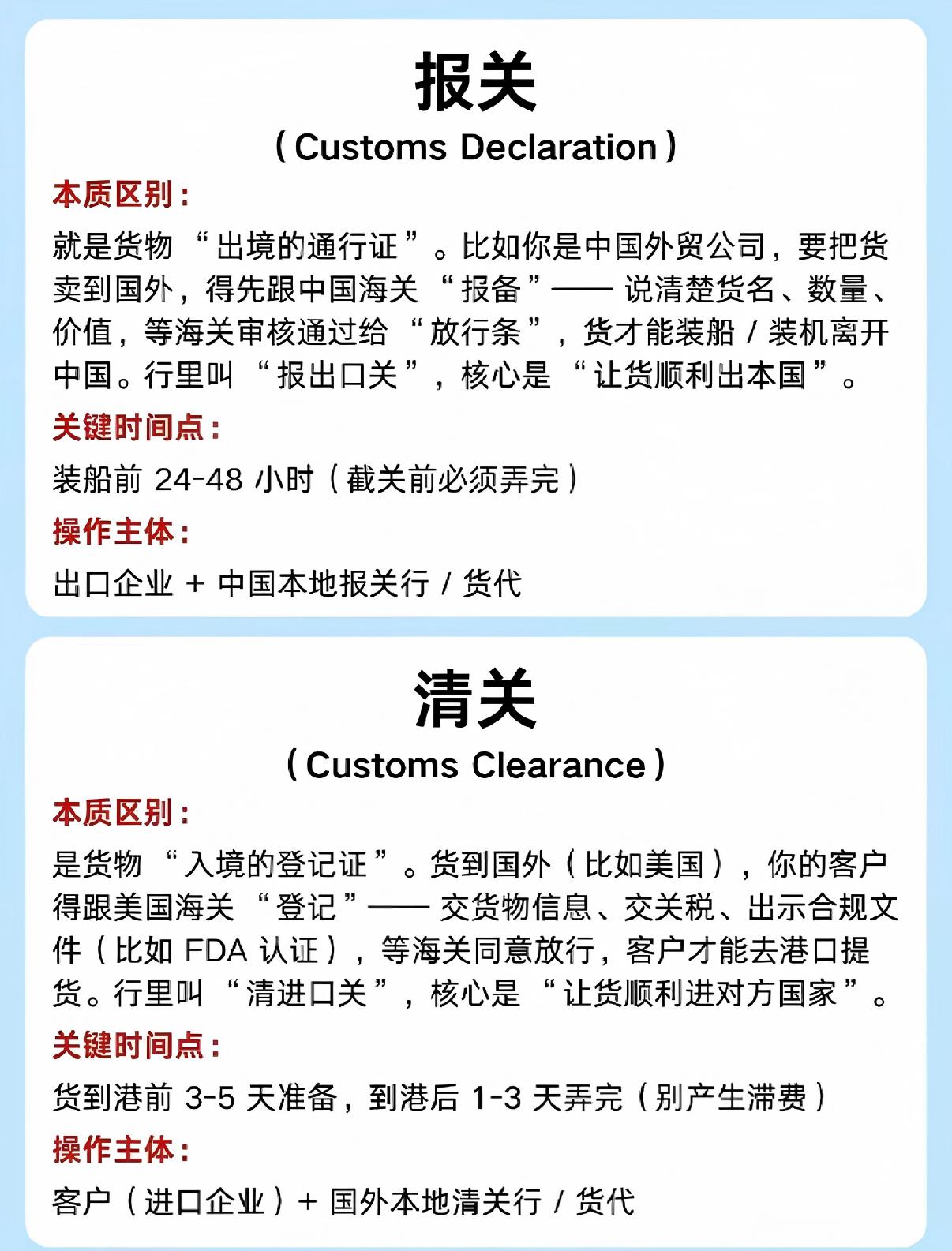 报关:是进出口企业 / 货代向海关申报货物信息的行为。清关:是海关完成审核、查验、征税、放行的整个流程结果。